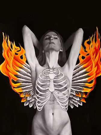A painting using symbolism to tell a story of growth and recovery.Angel wings represent hope, guidance, and protection. Fire stands for energy, power and passion. The ribcage functions as bars to the heart.